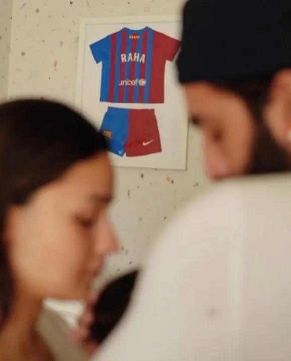 The images of Ranbir, Alia and Raha are not very clear in the picture owing to the depth of field of the lens, but one can clearly see the name 'Raha' on the FC Barcelona jersey hanging on the wall behind them. Ranbir is known to be a fan of the Spanish football club, which is at the top of La Liga football this year.